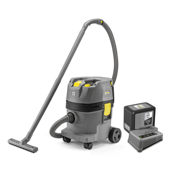 Kärcher NT 22/1 Ap Bp L Battery-powered wet and dry vacuum cleaner – compact, lightweight and versatile: Thanks to its powerful Kärcher Battery Power battery, the NT 22/1 Ap Bp battery-powered wet and dry vacuum cleaner also impresses in locations without an external power supply for demanding dry and wet applications. The Kärcher Battery Power+ battery, which is protected against dirt and liquids by a flap, ensures high suction power and a long runtime of the vacuum cleaner. The versatile machine is equipped with a space-saving pleated flat filter and electronic water shut-off and is therefore suitable for vacuuming liquids, coarse dirt and fine dust. With its compact dimensions and low weight, transport and handling are very easy – especially also in tight spatial conditions and heavily used areas. The flat head design of the machine also means that it can be placed on tools and boxes.