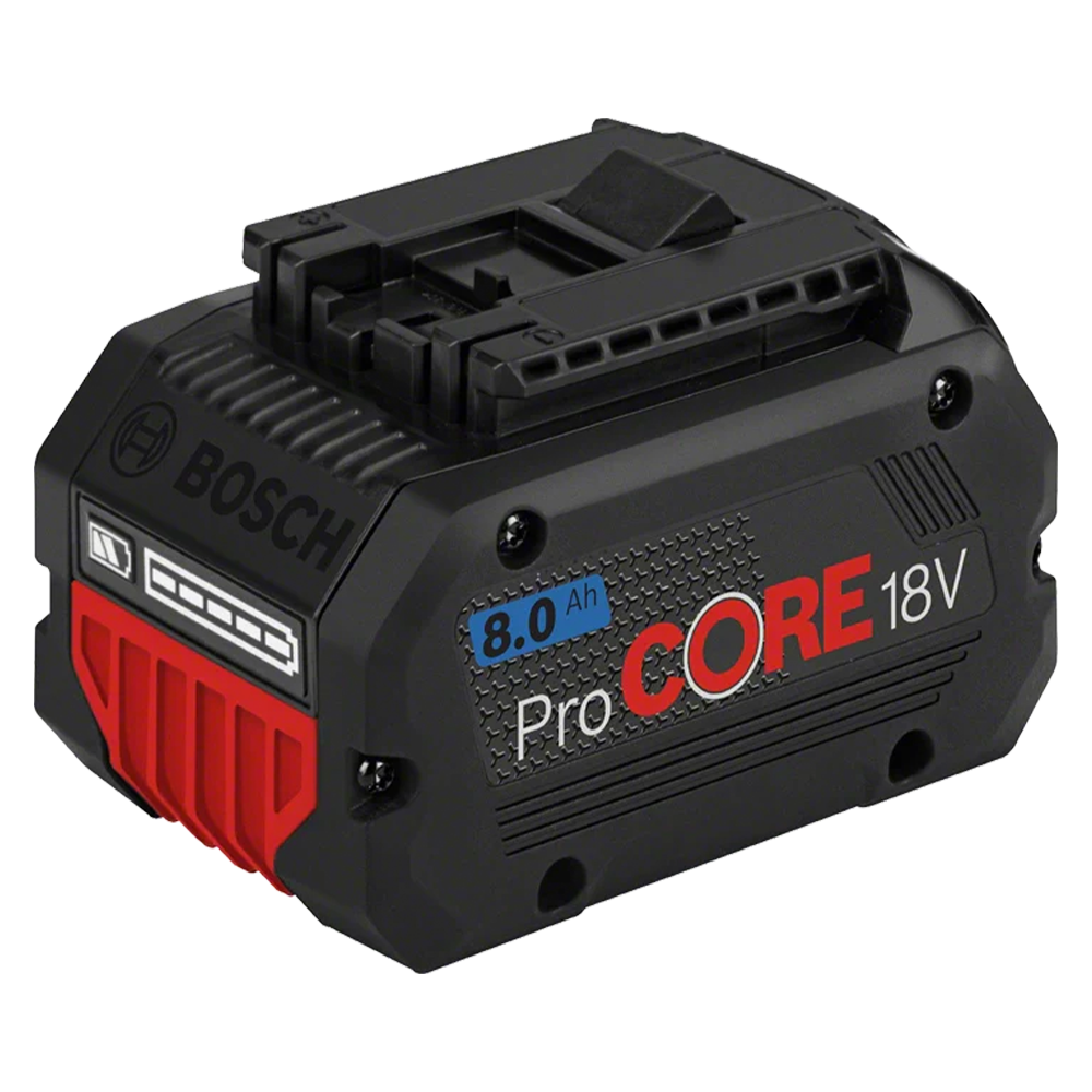 The ProCORE18V 8.0Ah Professional is a high-performance battery from the Bosch ProCORE18V series, which provides the equivalent of up to 1,800 watts of corded power. Its new-generation cell technology, combined with Bosch's intelligent battery management, delivers 87% more power than conventional batteries.