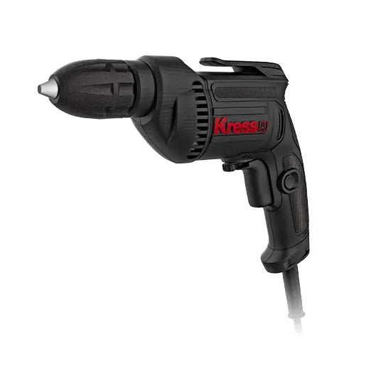 The Kress 500W 10mm KU110K hand drill features a variable mechanical transmission, making it versatile for a wide range of drilling applications. Its robust motor ensures maximum drilling capacity in wood, steel and aluminum. Designed with all-metal gears, this drill offers exceptional durability for use on the job site. The compact and lightweight design increases maneuverability and the all-metal keyless chuck improves the drill's strength and durability. Ideal for tight corners and continuous overhead tasks, it includes a soft rubberized handle for greater comfort during use.