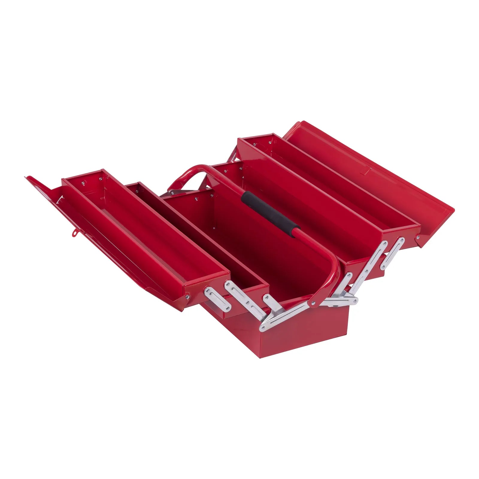 Made from high-quality carbon steel, this toolbox is sturdy and durable, with a rivet-fastened folding bar for increased load capacity. It features a unique two-way opening design with five retractable trays, ensuring organized and easy access to tools. Although its sturdy construction adds some weight, the integrated handle ensures portability. The metal surface is treated for easy cleaning and rust prevention, with curved edges to protect hands from scratches. Ideal for workshops, garages and workshops, it is a versatile and essential tool storage solution.