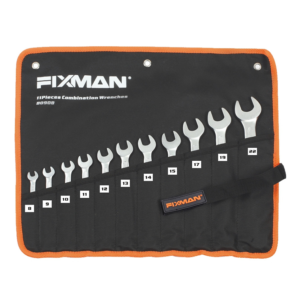 FIXMAN combination wrench set p in a bag. These combination wrenches are made of durable chrome vanadium steel (40Cr-V). The design includes a non-slip surface and micro finish. The set includes sizes from 8 to 22 mm.