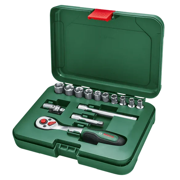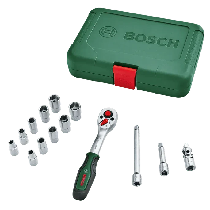 The high-quality Bosch 14-piece ¼-inch socket set is the practical helper for DIY mechanics and assembly tasks. The set consists of a ¼-inch ratchet, an adapter, 10 sockets and 2 extension bars, all housed in a practical storage case. The ratchet delivers an impressive torque of 74-93 Nm or 20-50% above the DIN standard and can work at an angle of 5° thanks to the 72-tooth gear. To reach tight spots with comfort and control, the ratchet has an ergonomic, curved handle with soft-grip areas.