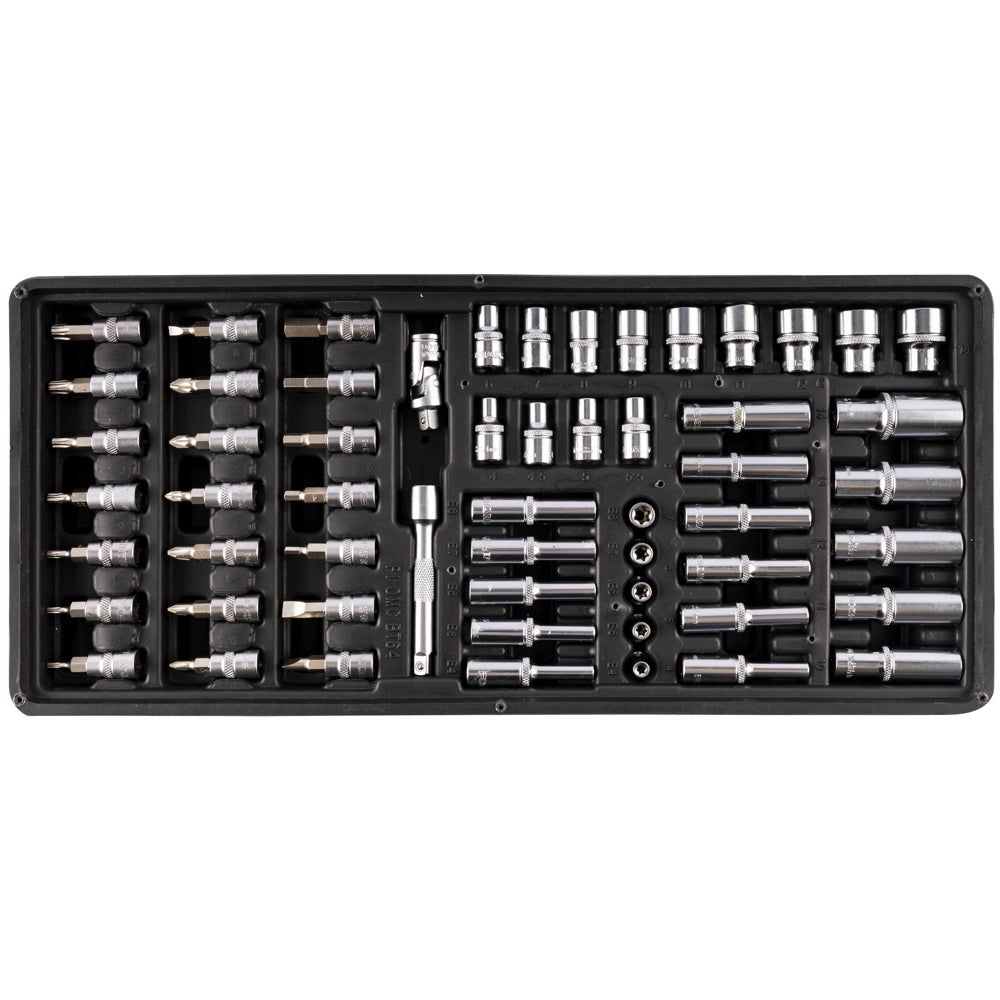 Insert for tool our tool cabinets. Drawer size 1/3, 57 pieces. The set consists of ¼ drive sockets. Covering a variety of normal sockets HEX, TORX as well as various favorite bits. Made of high quality chrome vanadium steel.
