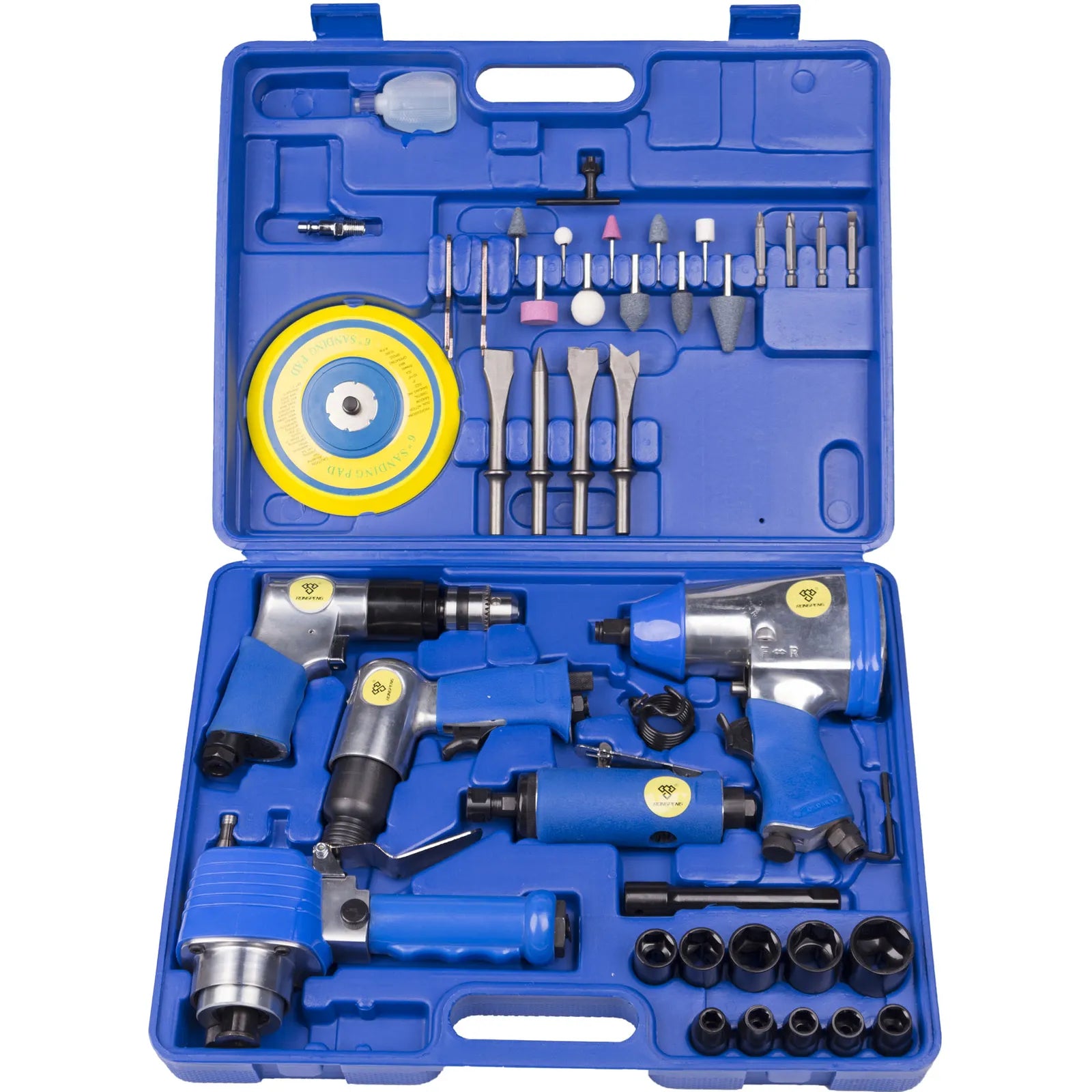 This tool kit contains various pneumatic tools: impact wrench, pneumatic grinder, pneumatic hammer, pneumatic sander, pneumatic drill, as well as many accessories.