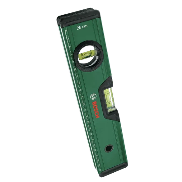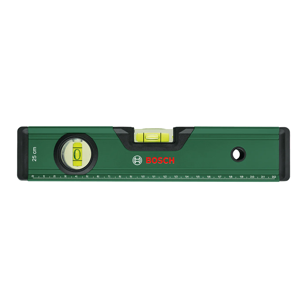 With the Bosch Spirit Level 25cm, shelves and pictures will be hanging straight in no time. This handy all-rounder offers highly accurate results down to 0.05 mm/m thanks to horizontal and vertical spirit levels. Reading the level is easy thanks to the glowing, fluorescent bubble liquid in the vials. This spirit level has a metric scale from 0 to 22 cm, so there’s no need to look for a second tool as it doubles as a ruler.