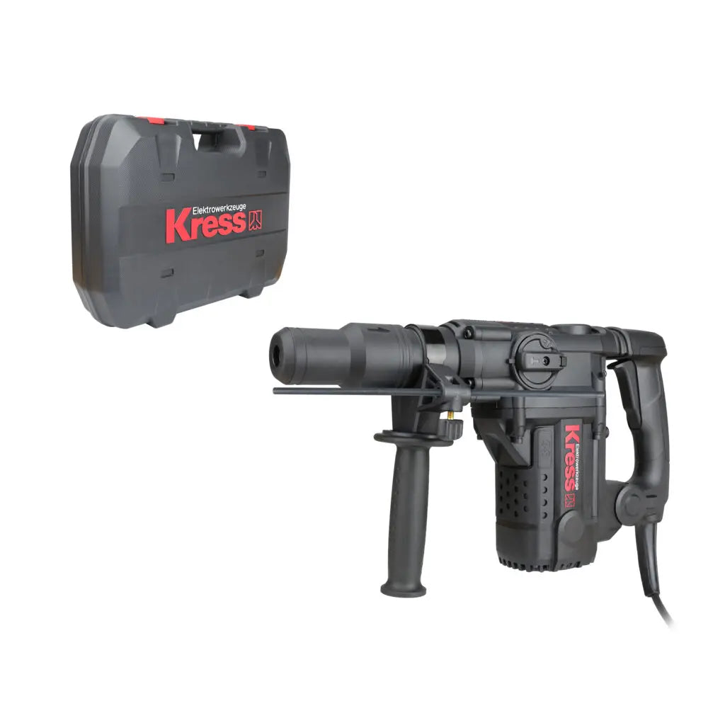 O martelo rotativo KRESS 1050W SDS Plus de 38 mm oferece potentes 7,5 J de energia de impacto e 4150 BPMS de potência de perfuração de alta velocidade em diâmetros de até 38 mm para remoção máxima de material. Oferece a versatilidade de 2 Funções; Perfuração e cinzelamento com martelo e batente rotativo, bem como um mandril SDS MAX para fácil troca de brocas. A tecnologia antivibração combinada com um design ergonômico oferece maior conforto e controle geral. Possui proteção contra sobrecarga para proteger o motor de aquecimento excessivo. Inclui 1 alça auxiliar, 1 medidor de profundidade e um estojo de transporte resistente para armazenamento e transporte.