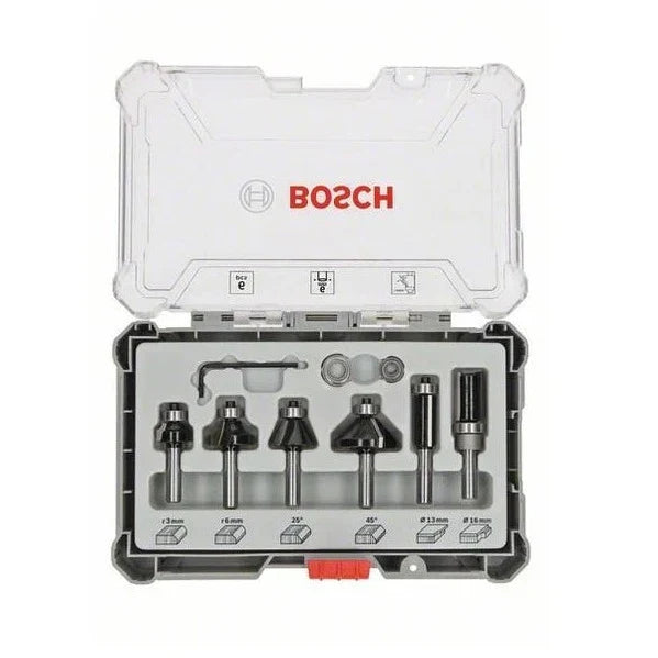 Este conjunto de fresagem de arestas de 6 peças contém fresas para fresamento de arestas, chanframento e arredondamento, e também é fornecido com peças de reposição adicionais, como uma chave Allen e dois rolamentos de esferas.
