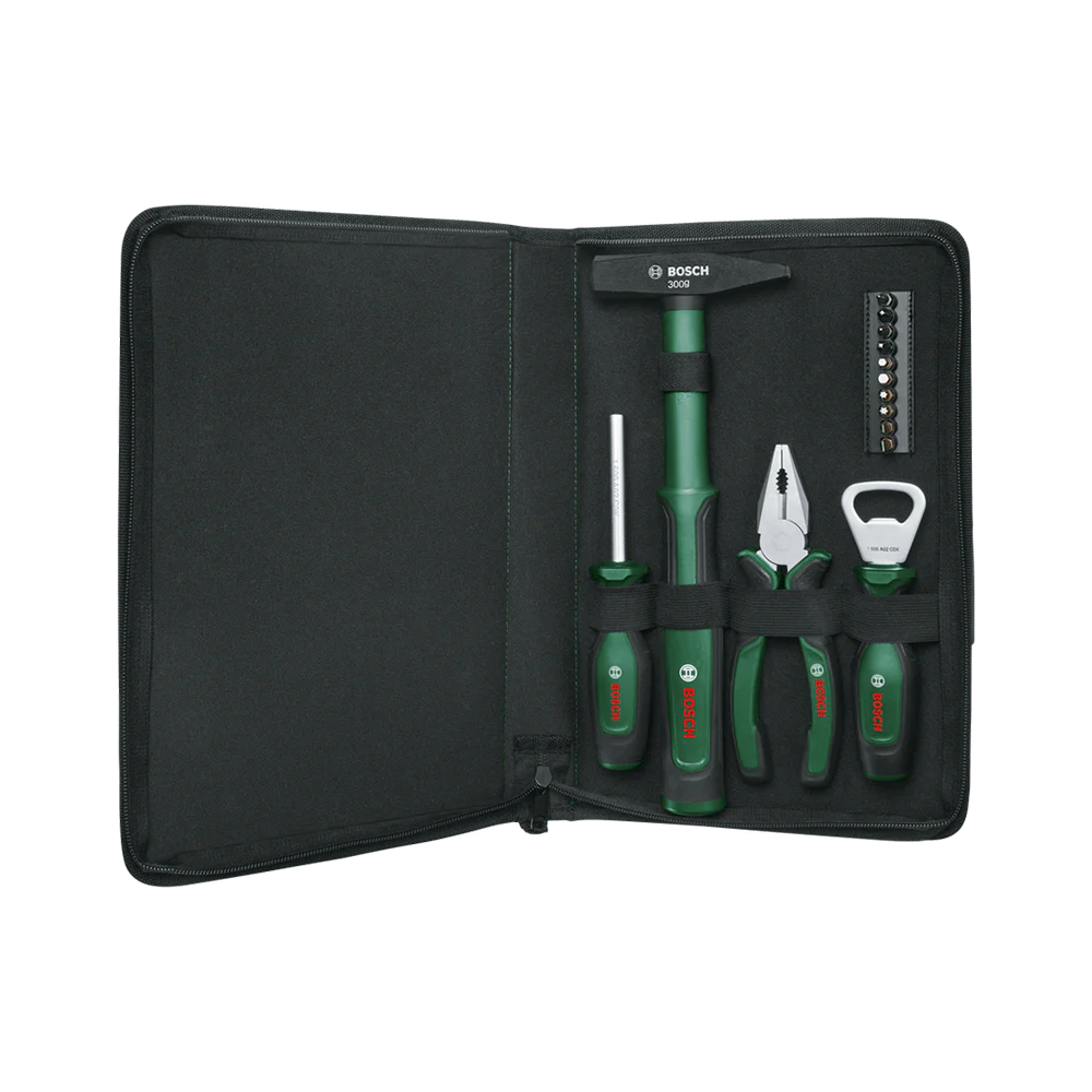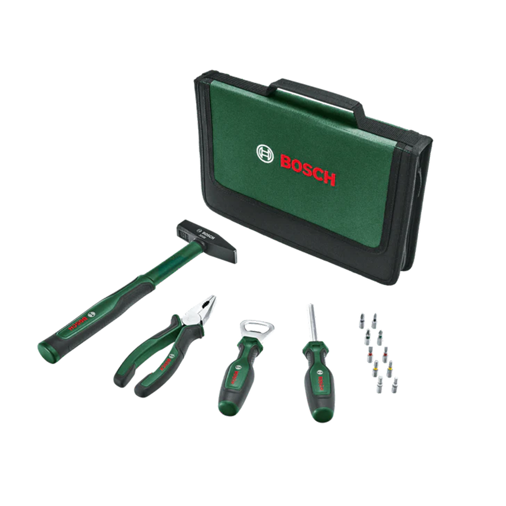O conjunto de ferramentas manuais Easy Starter de 14 peças da Bosch possui todas as ferramentas necessárias para reparos e manutenção DIY, montagem de móveis ou construção básica. Convenientemente embalado em uma bolsa portátil de tecido com zíper, o conjunto contém um alicate combinado, um martelo de engenheiro de 300g, um abridor de garrafas e uma chave de fenda universal, além de 10 bits. Cada produto é fabricado de forma robusta com materiais de alta qualidade e ergonomicamente projetado para proporcionar uma vida útil prolongada, bem como conforto e controle ideais.