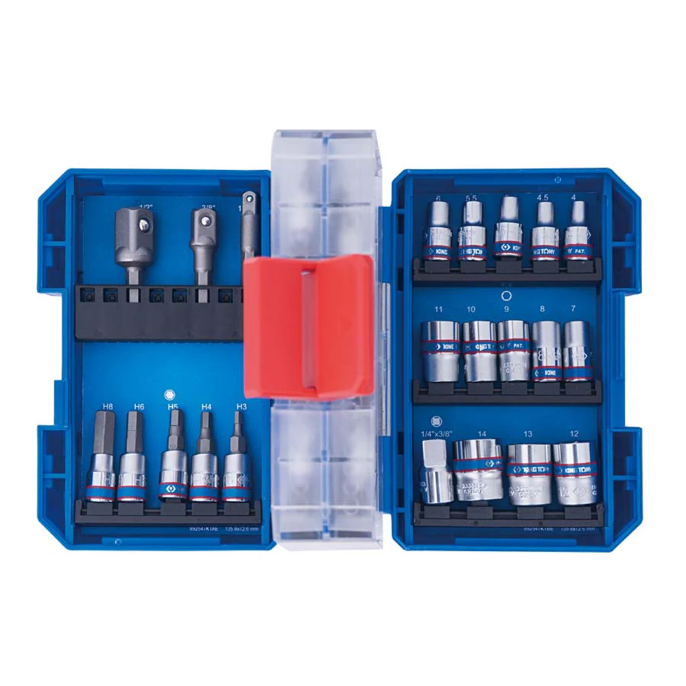 - Tamanhos de soquete 6 pontos: 4 – 4,5 – 5 – 5,5 – 6 – 7 – 8 – 9 – 10 – 11 – 12 – 13 e 14 mm (2335M)