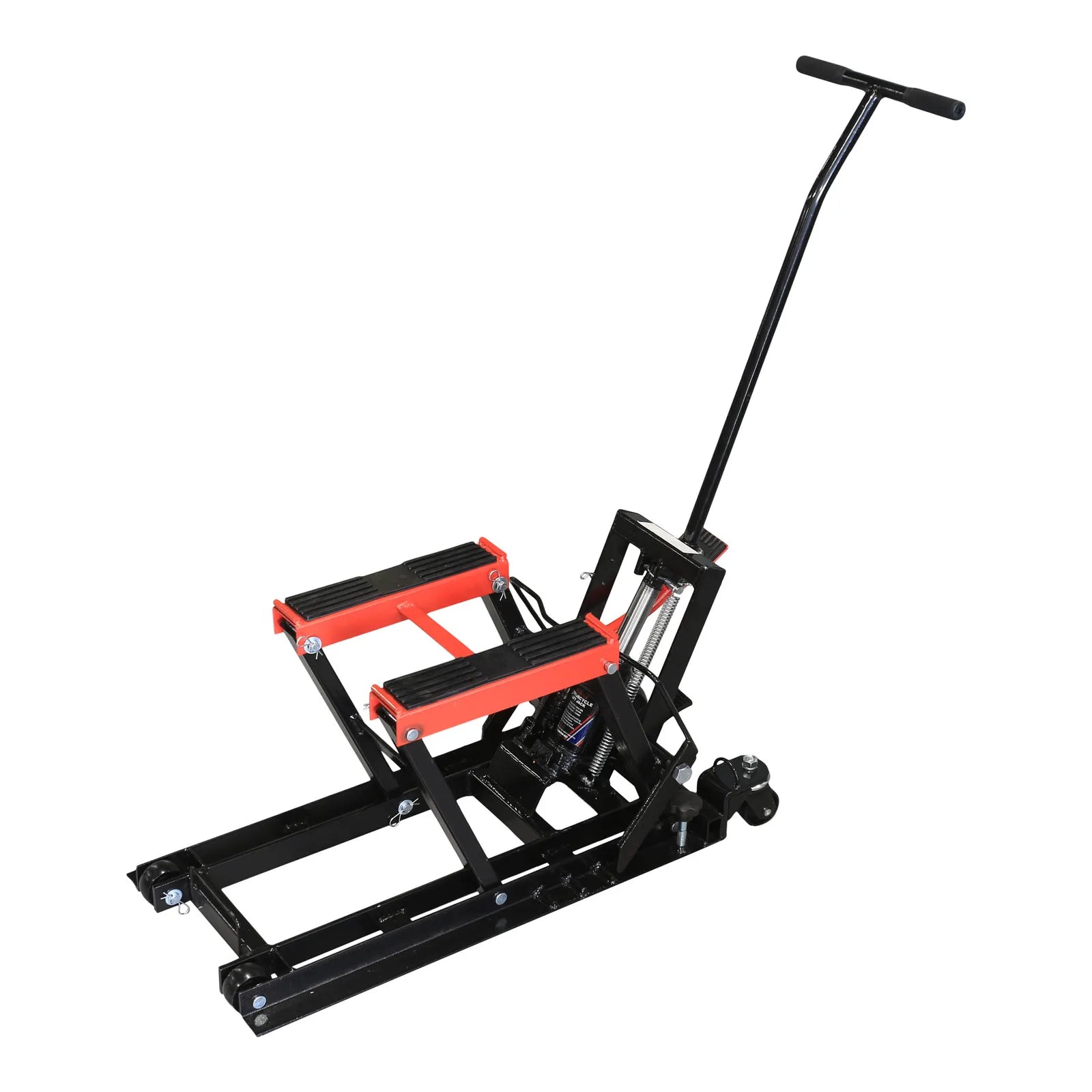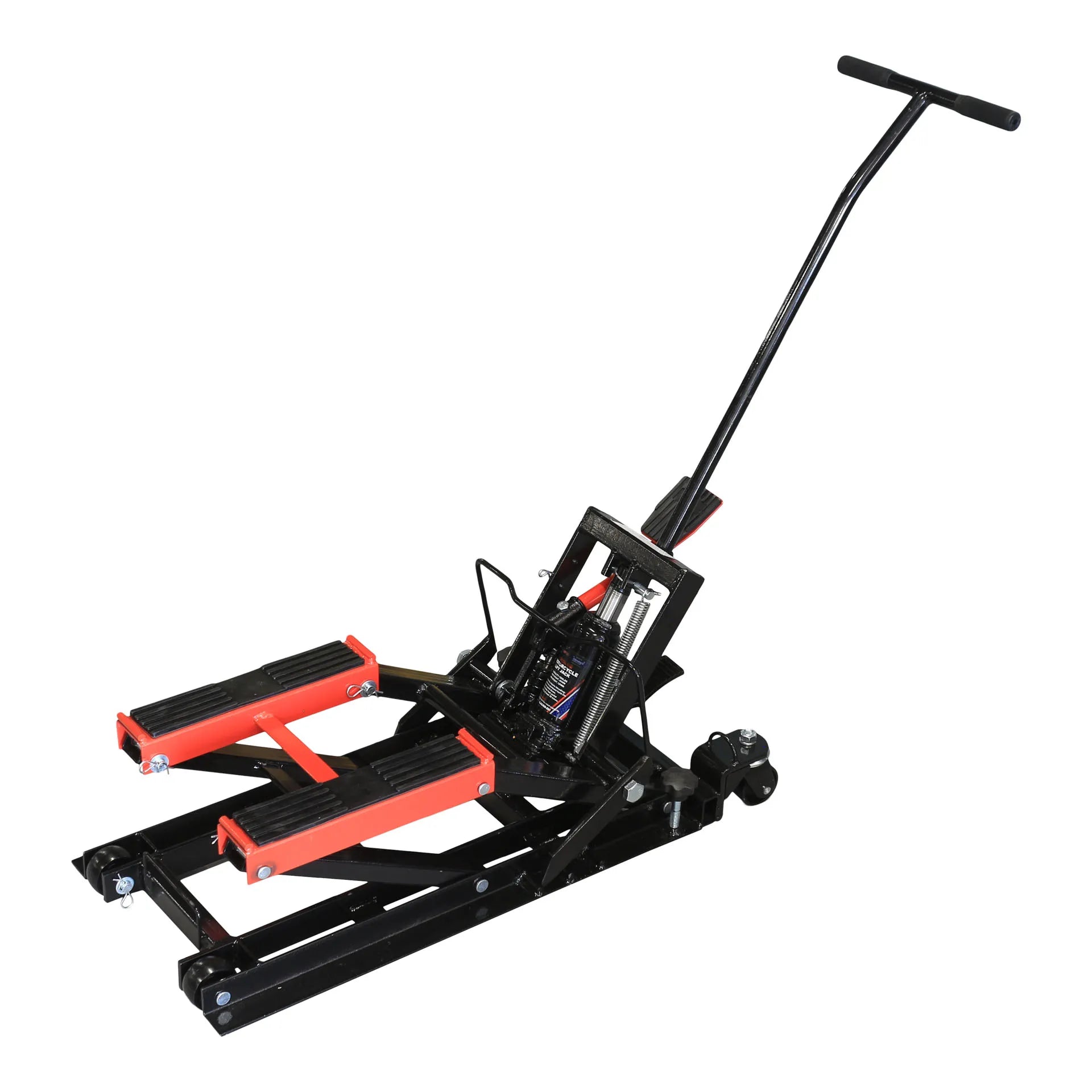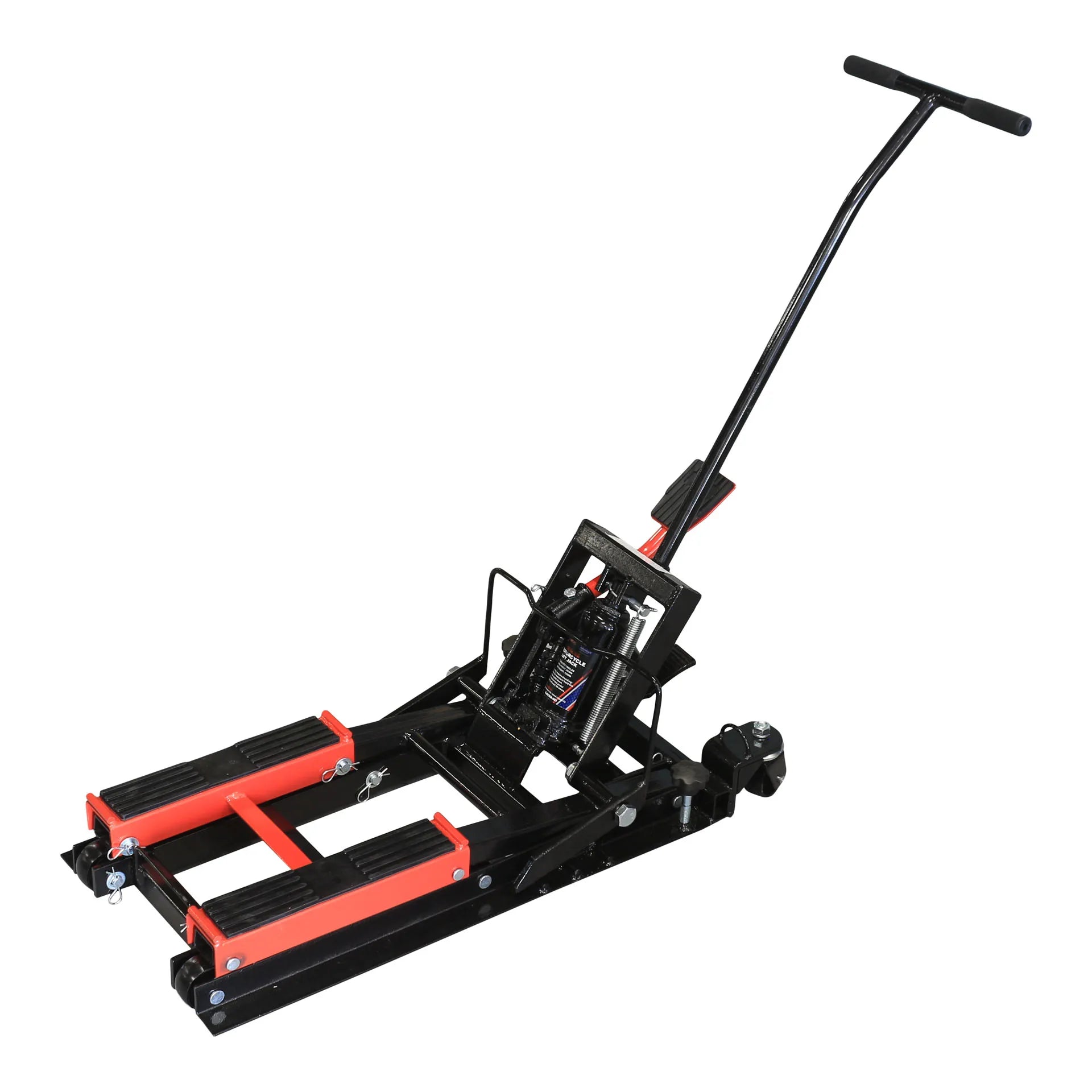 Este macaco para motocicleta possui uma bomba de pé de ação rápida e mecanismo de travamento de 3 posições. Ele é idealmente projetado para levantar motocicletas, ATVs, tratores, embarcações pessoais, etc. Os rodízios giratórios facilitam a movimentação, o posicionamento e o transporte. A caixa inclui um macaco, uma alça, duas barras adaptadoras e um manual. O elevador pode suportar uma carga de trabalho de até 680kg.