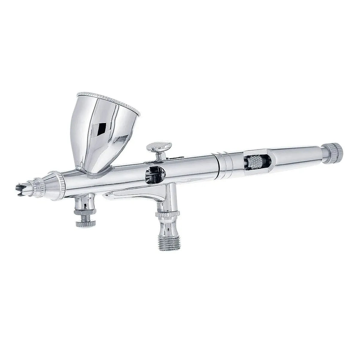 Sistema de cabeça de aerógrafo de 4 peças usinadas com precisão para atomização extremamente fina. Uma válvula de regulação de controle de ar direto na cabeça do aerógrafo permite uma pulverização microfina precisa com uma agulha e bico de 0.2 mm para um padrão de pulverização de linha fina.