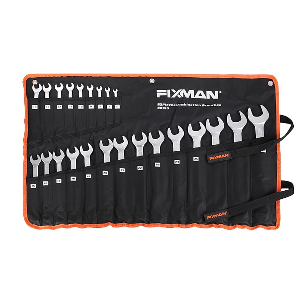 Conjunto FIXMAN de chaves combinadas p em uma bolsa. Essas chaves combinadas são feitas de aço cromo vanádio durável (40Cr-V). O design inclui uma superfície antiderrapante e micro acabamento. O conjunto inclui tamanhos de 8 a 32 mm.