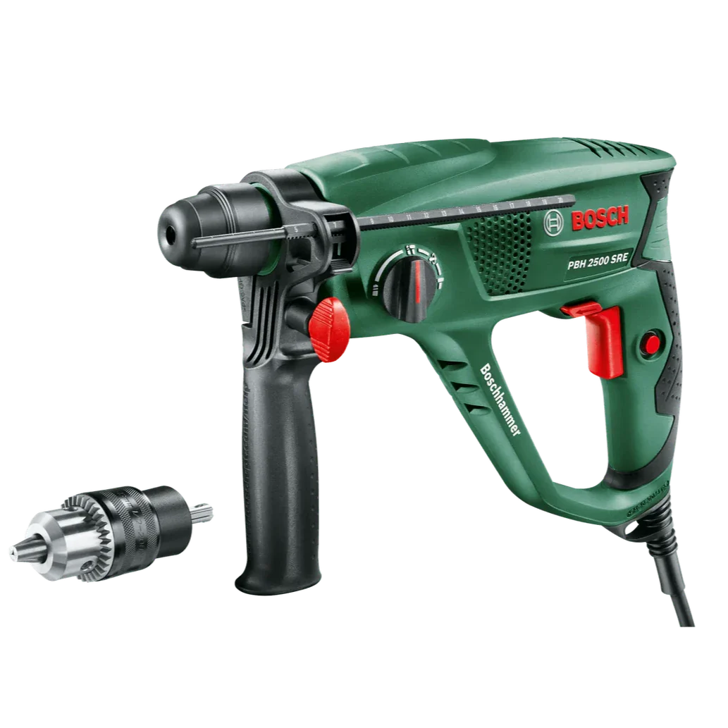 O martelo perfurador com fio PBH 2500 SRE é perfeito para perfuração pesada, martelamento e cinzelamento em concreto, alvenaria, azulejo, madeira e metal. Uma força de alto impacto de 1,9 joules é fornecida pelo seu mecanismo de martelo pneumático Bosch, alimentado por um forte motor de 600 W. Seu mandril SDS plus permite a troca de acessórios sem chave e permite inserir o mandril adaptador incluído para usar brocas de haste redonda. Um ângulo de trabalho ideal é garantido pela função de cinzel Vario Lock, que fornece 36 posições de cinzel selecionáveis. O Controle Eletrônico de Velocidade da Bosch fornece a velocidade correta para o material por meio do gatilho sensível à pressão.