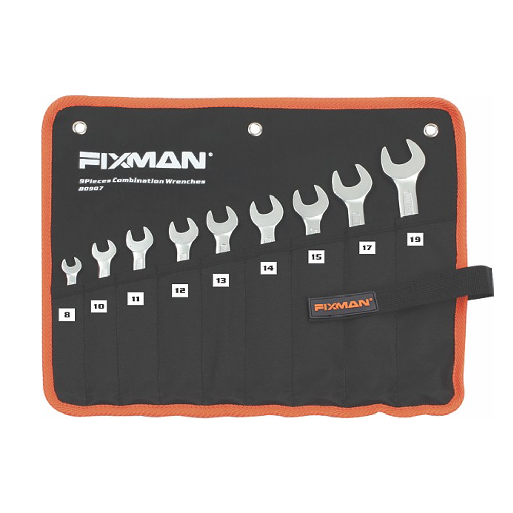 Conjunto FIXMAN de chaves de boca luneta em uma bolsa. Essas chaves combinadas são feitas de aço cromo vanádio durável (40Cr-V). O design inclui uma superfície antiderrapante e micro acabamento. O conjunto inclui tamanhos de 8 a 19 mm.
