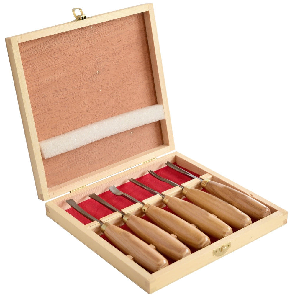 Conjunto de formão de escultura em madeira de 6 peças em em caixa de madeira