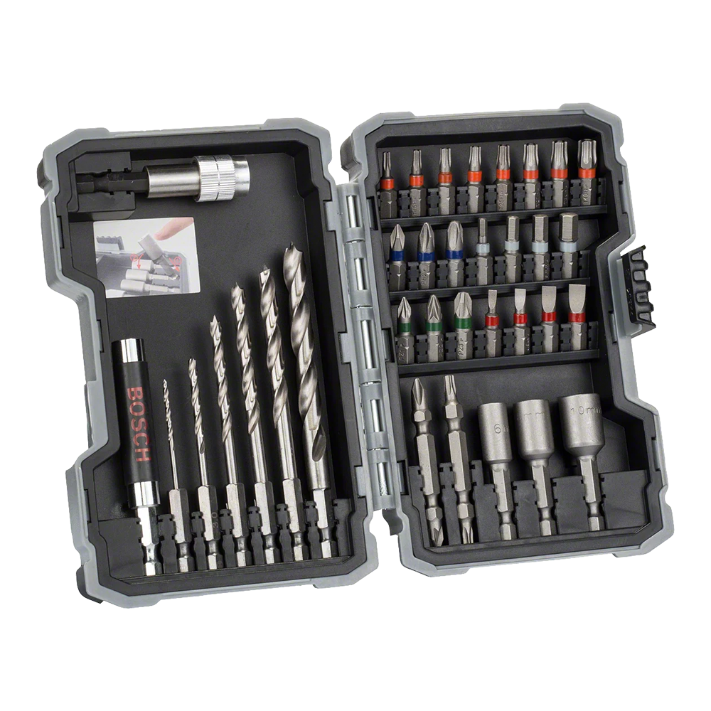 • O conjunto contém: PH1, PH2, PH3 PZ1, PZ2, PZ3 S 3/4/5/6 HEX 3/4/5/6 TH10, TH15, TH20 (2x), TH25, TH27, TH30, TH40 Nutsetter 6/8 /10 mm HSS 2.0/3.0/4.0/5.0/6.0/8.0 mm Lâmina dupla PH2/PZ2 Lâmina dupla Th20/Th25
