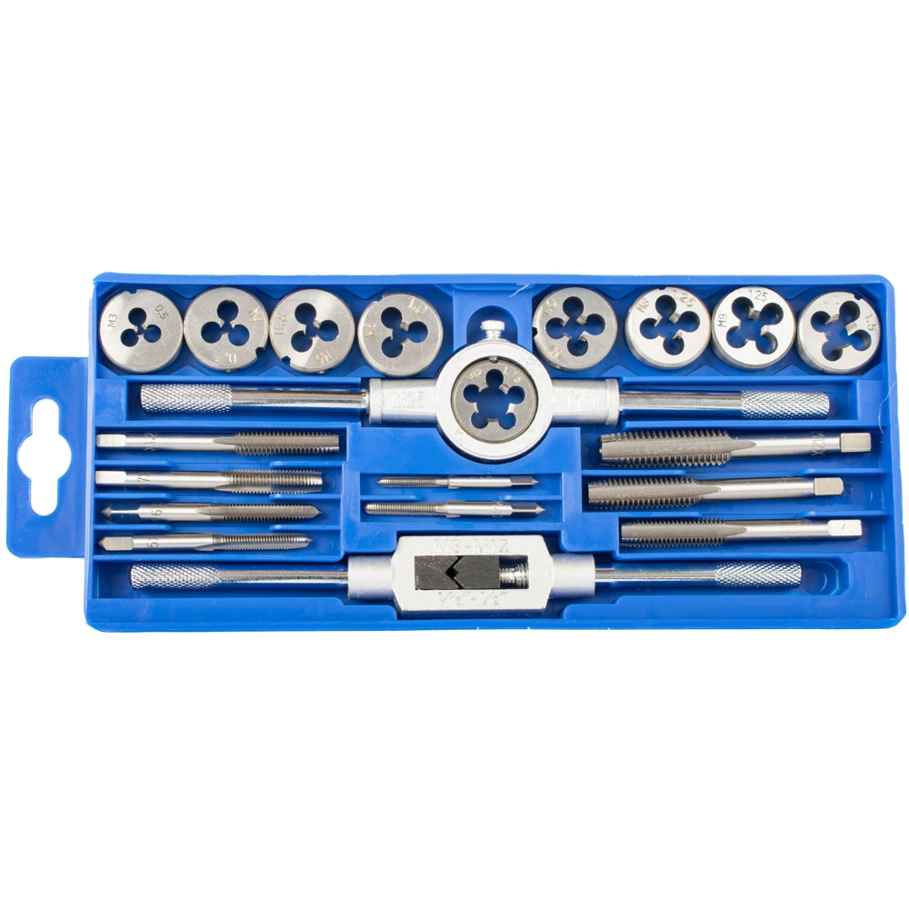 O conjunto de macho e matriz de aço carbono TorkCraft de 20 peças, 9 machos e 9 matrizes incluídos entre os tamanhos M3 - M12, 1 chave de torneira e 1 chave de matriz.