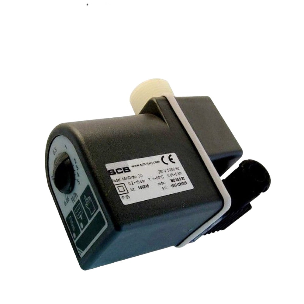 O MiniDrain consiste em uma válvula solenóide servoassistida que abre mediante comando de um circuito eletrônico de acordo com a capacidade de drenagem. A capacidade de drenagem é predefinida por meio de um botão localizado no painel de controle.
