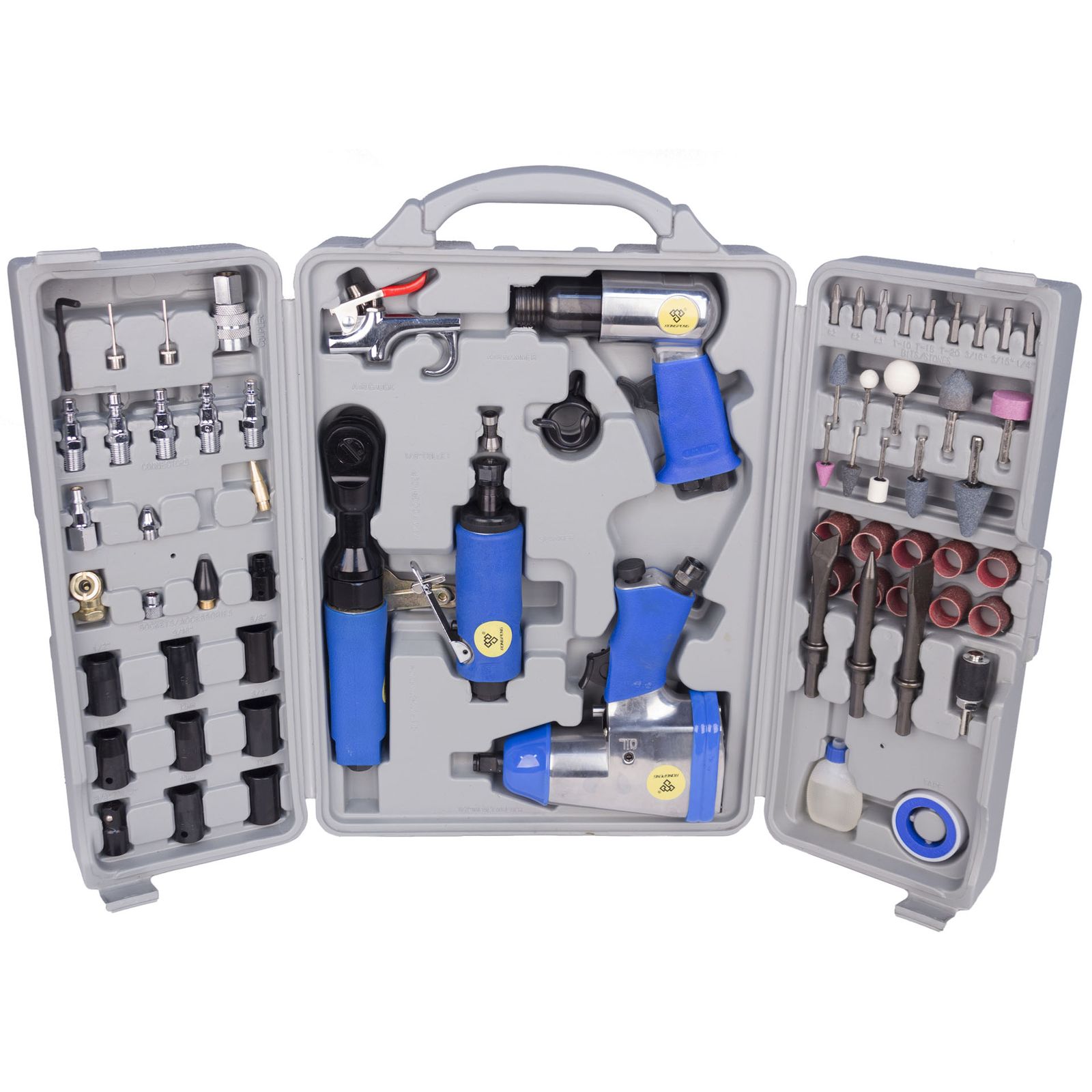 Este kit de ferramentas contém várias ferramentas pneumáticas: chave de impacto, retificadora pneumática, martelo pneumático, catraca e espanador pneumático/infiltrador de pneus, bem como muitos acessórios.