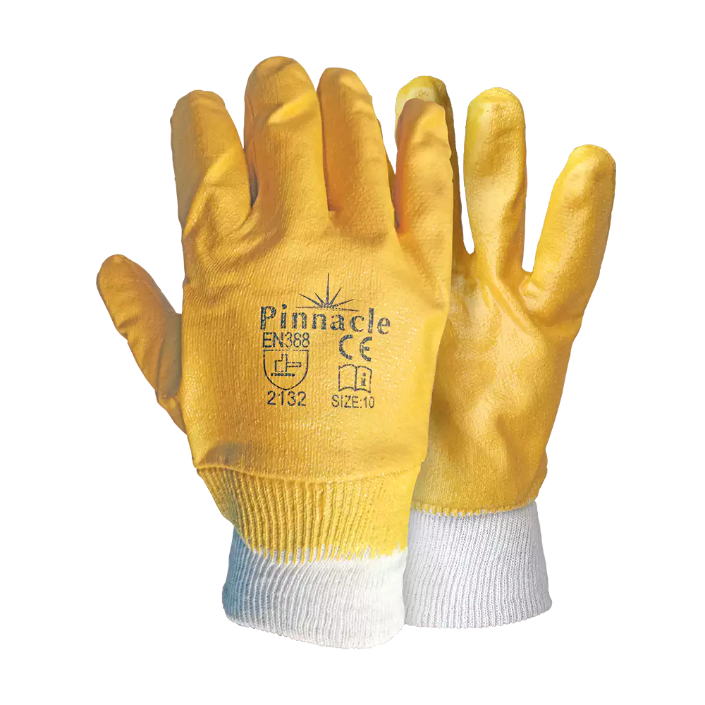 Luva de nitrilo para manuseio de produtos químicos com pulso em malha amarela. O revestimento totalmente nitrílico, flexível e liso, resiste a condições de óleo e abrasivas. Os níveis de proteção são medidos na área da palma da luva. Categoria de segurança intermediária.
