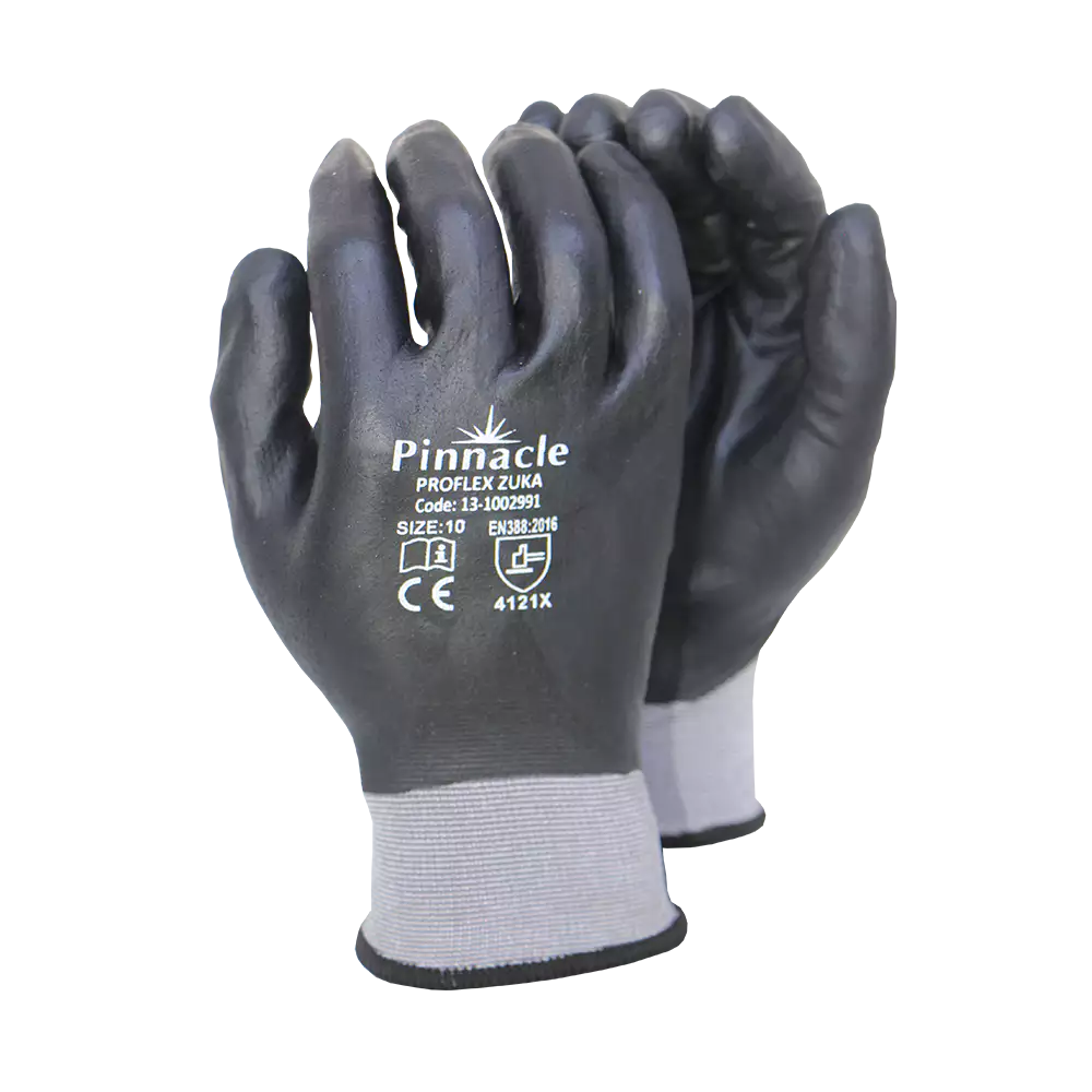 Proflex ZUKA, luvas com acabamento em microespuma nitrílica totalmente revestidas, excelente desempenho de aderência em piso molhado e seco. Um forro de náilon com spandex proporciona sensibilidade e destreza, enquanto o revestimento de nitrila protege as mãos de cortes e abrasões.