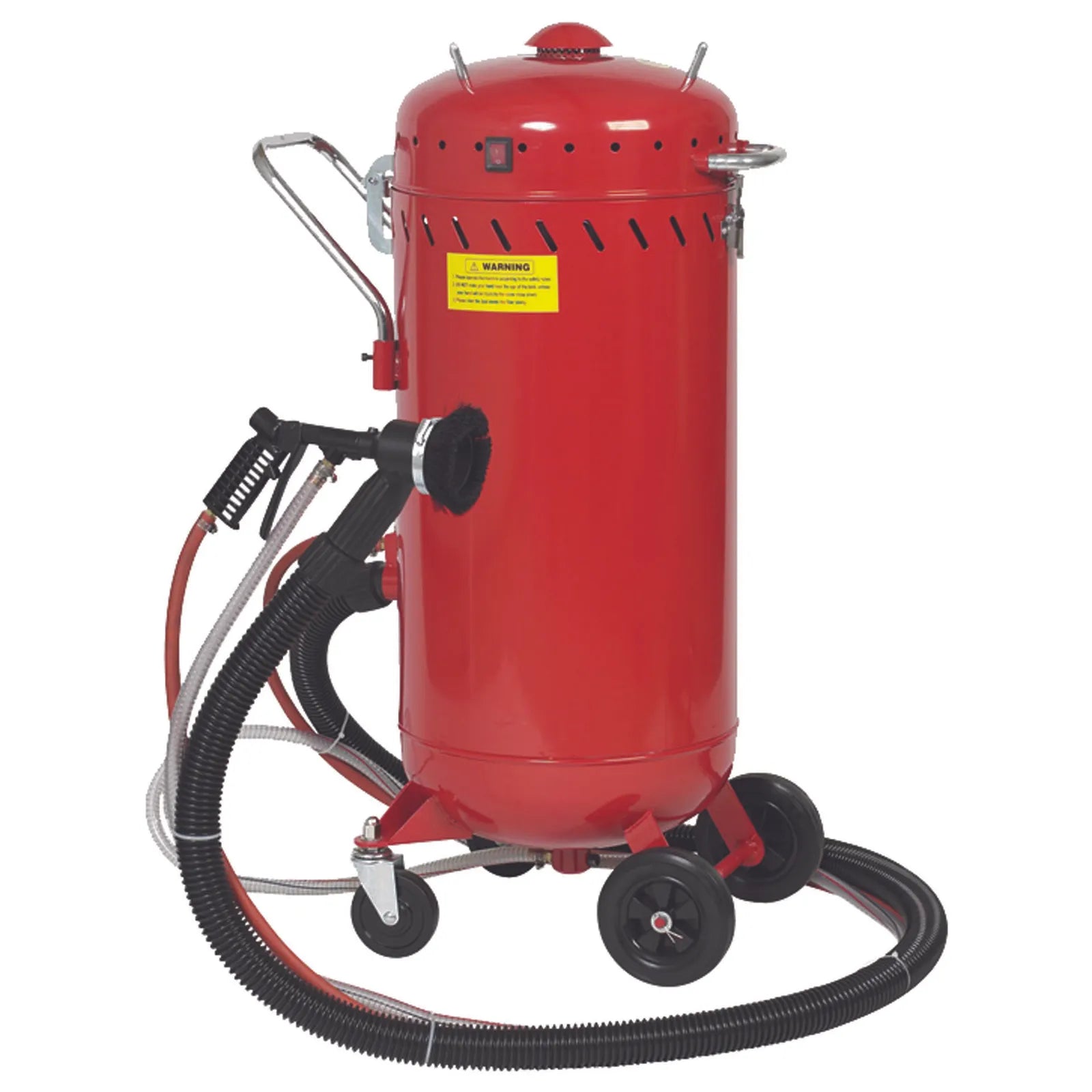Este blaster abrasivo usa um motor elétrico integrado para reciclar continuamente o material abrasivo enquanto a unidade jateia as superfícies. Requer um compressor para funcionar.